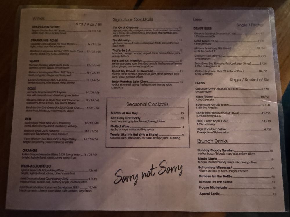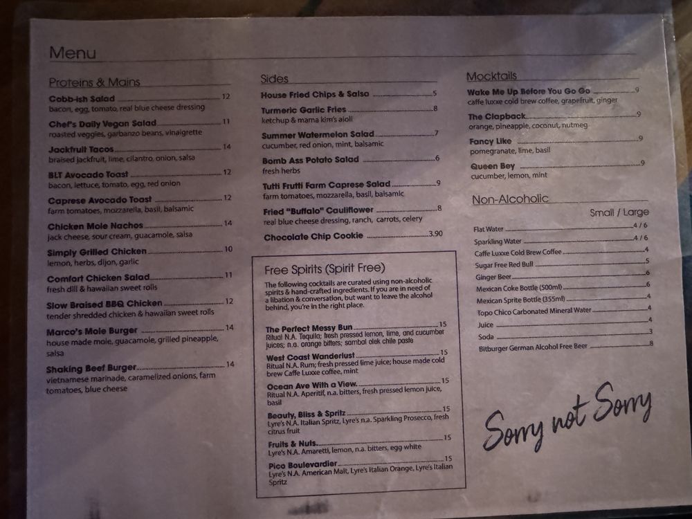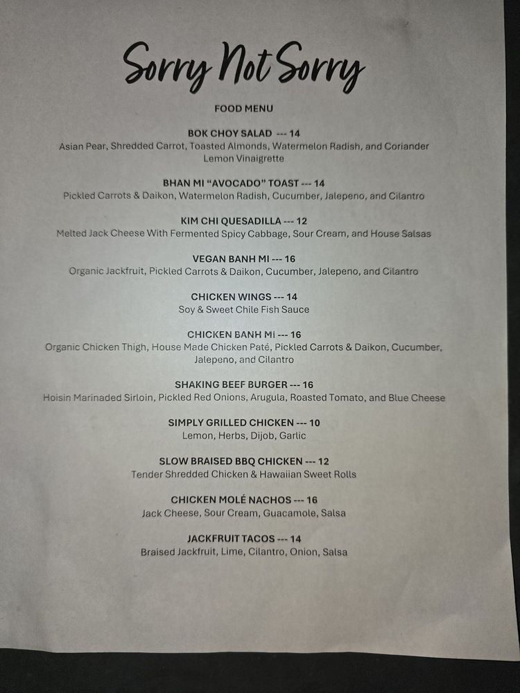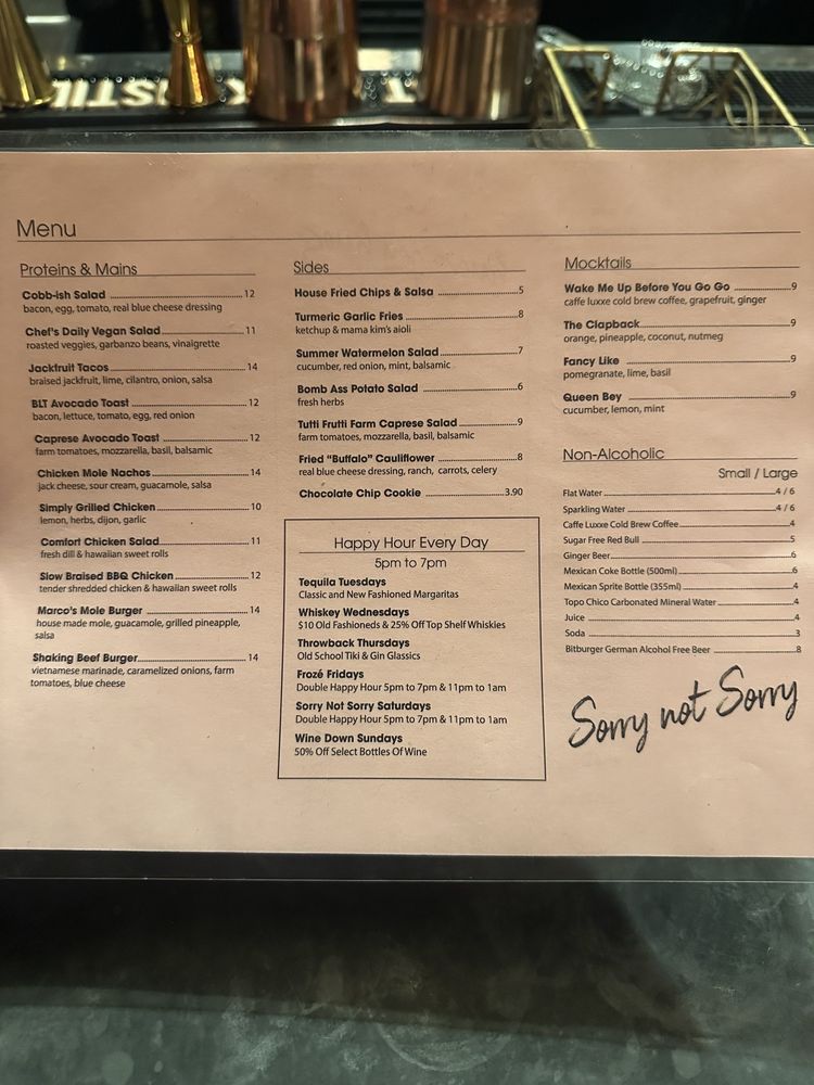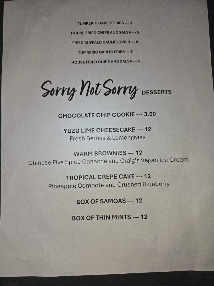 Sorry Not Sorry is a trendy cocktail bar and New American restaurant located in Los Angeles, CA. Offering vegan options and a variety of handcrafted cocktails, the menu caters to all dietary preferences. Customers rave about the mole nachos and drinks with mezcal. The outdoor seating area, complete with heat lamps for colder nights, provides a casual and spacious atmosphere. Service may be slow during peak times, but the friendly staff and diverse menu make up for it. DineLA participants praise the affordable and delicious offerings, such as the baby bok choi salad, kimchi quesadilla, and tropical crepe cake. With attentive service and unique dishes like the bomb ass potato salad and fried buffalo cauliflower, Sorry Not Sorry is a must-visit for food and cocktail enthusiasts in LA.